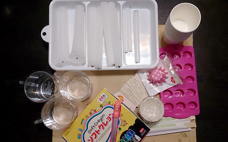 計量カップ3個、クレヨン、シリコン型、カップケーキ型、仕切りケースは、すべて百均で揃えました。紙コップ、割り箸、カッター、たこ糸、香水などは家にあったもので、ロウソクは仏具用の使いかけのものです。今回は使わなかったものもありました。