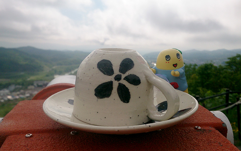 ようたんからオーダーしてもらったカップ&ソーサーが焼き上がったので、朝の階段修行に持ってきました。実際に送るものは、これよりもサイズが大きめのものなので、こちらは里親募集中です。イメージは「可愛くて大人っぽい」です。大胆な黒い花柄模様(なのか?)と白御影土のブツブツがマッチしています。気に入ってくれるといいなっしー。