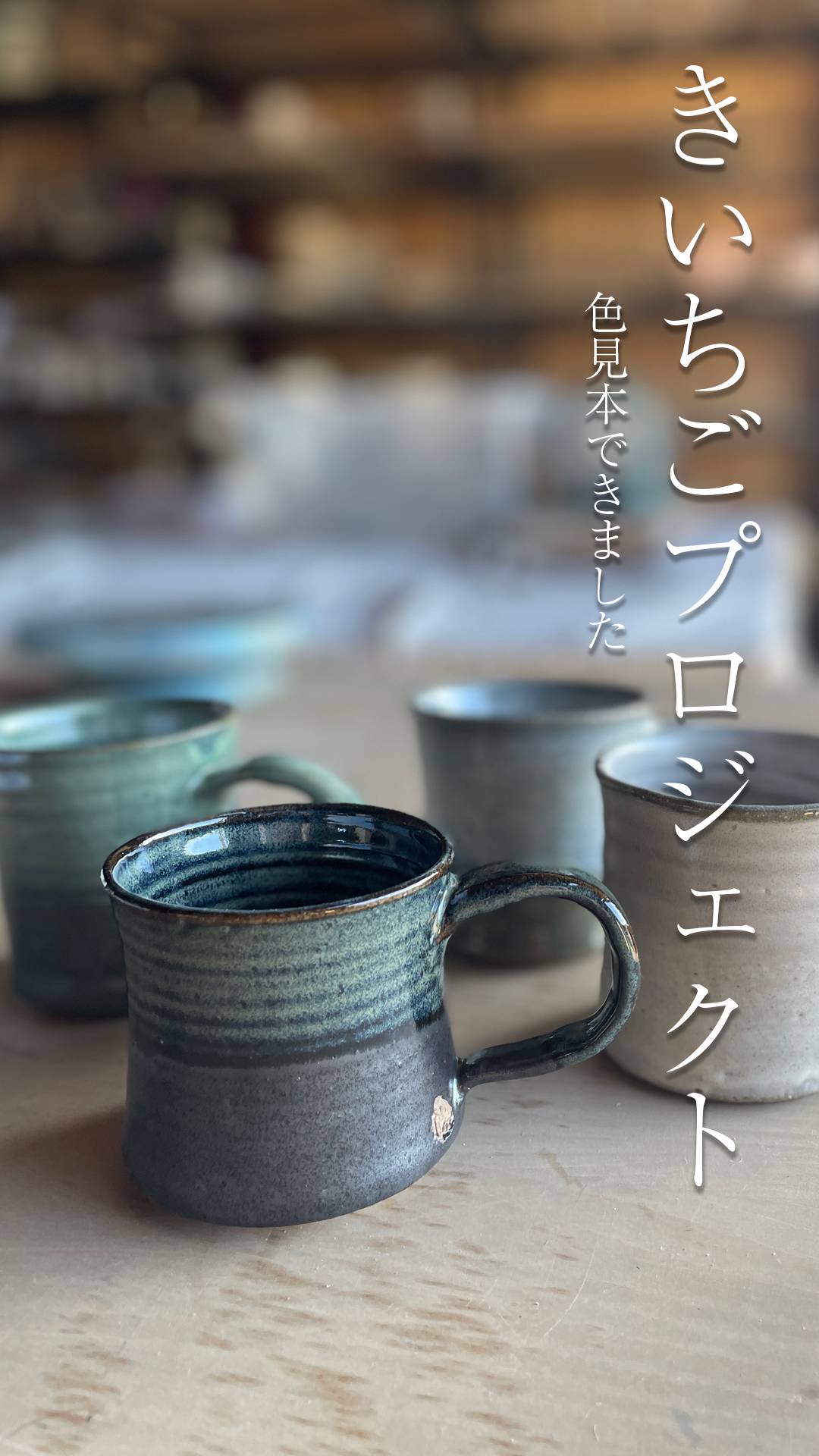 通常、色見本は小さなテストピースで作ることが多いのですが、結果がイメージしやすいようマグにしました。ベースとなる釉薬を潜らせてから、重ね掛けで変化が出てくる「白萩」を上半分と内側に掛けましたが、私が普段使う釉薬はほぼ決まっているので、全部試すというのは久々でした。