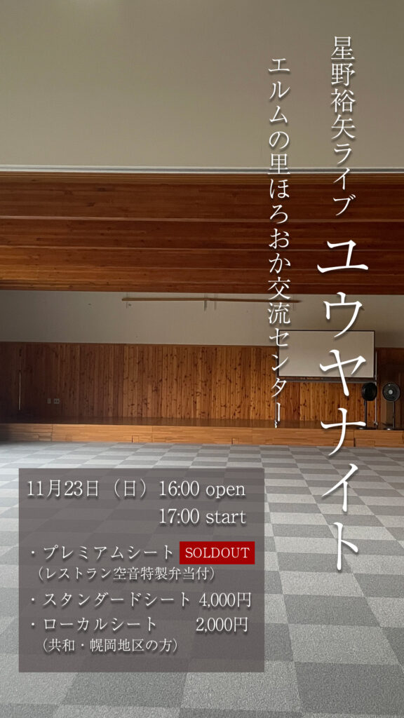 11月23日の星野裕矢さんのライブ「ユウヤナイト」については、会場が手狭になりましたので、近くの「エルムの里ほろおか交流センター」で行うことにしました。