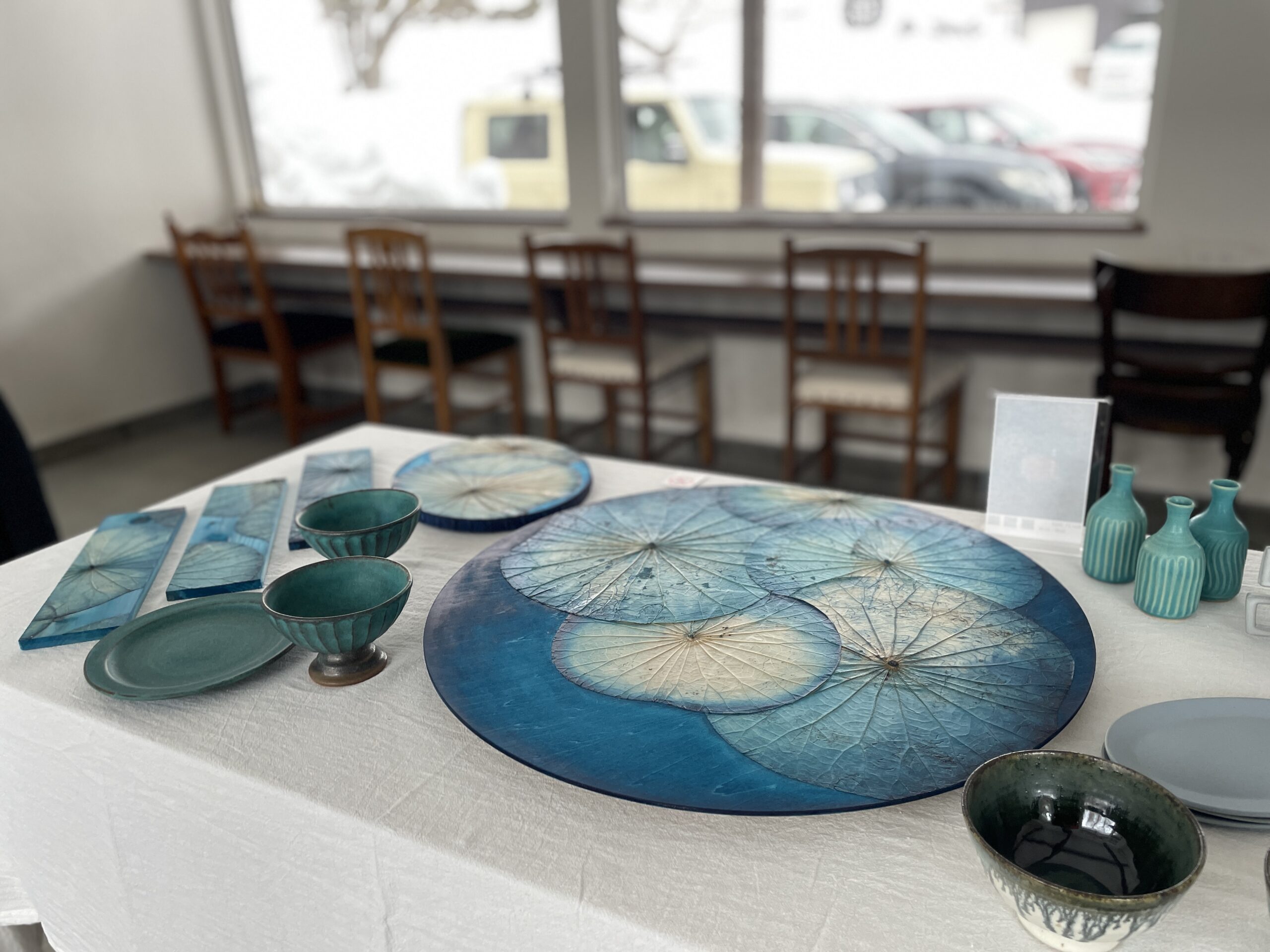 「ボタニーペインティング」というアートです。木のプレートに蓮の葉を貼り、アクリル絵の具で彩色をしていくようです。カラフルな作品が多い中、彼女の作品は青を基調としていて、凛とした美しさがあります。